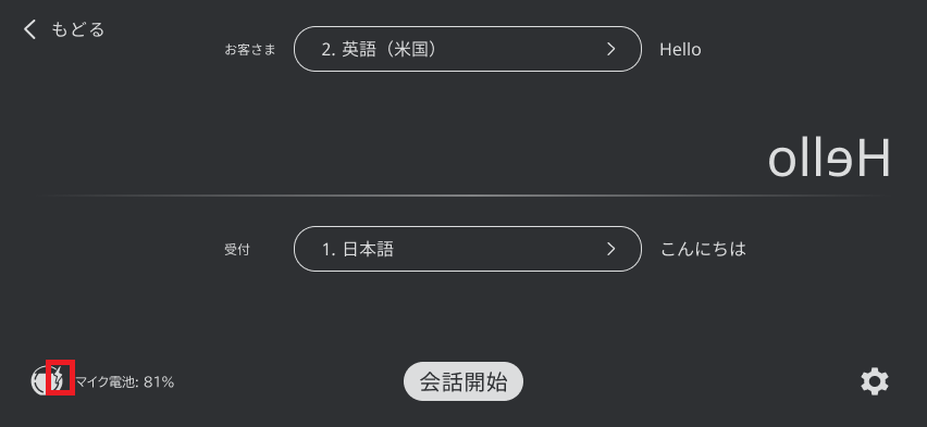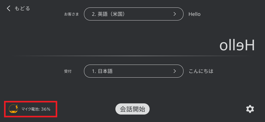 マイクの電池残量を確認する 待ち受け後の会話開始画面で、マイクの電池残量と充電状態を確認することが出来ます。 待ち受け後の会話開始画面で、マイクの電池残量と充電状態を確認することが出来ます。 確認方法 マイクの電池残量が、画面左下のアイコンと%表示で確認できます。 ケーブルを接続し、充電が行われている場合は⚡マークが表示されます。 電池残量が50%を下回ると黄色く表示されます。 電池残量が25%を下回ると赤く表示されます。 ご説明は以上です。