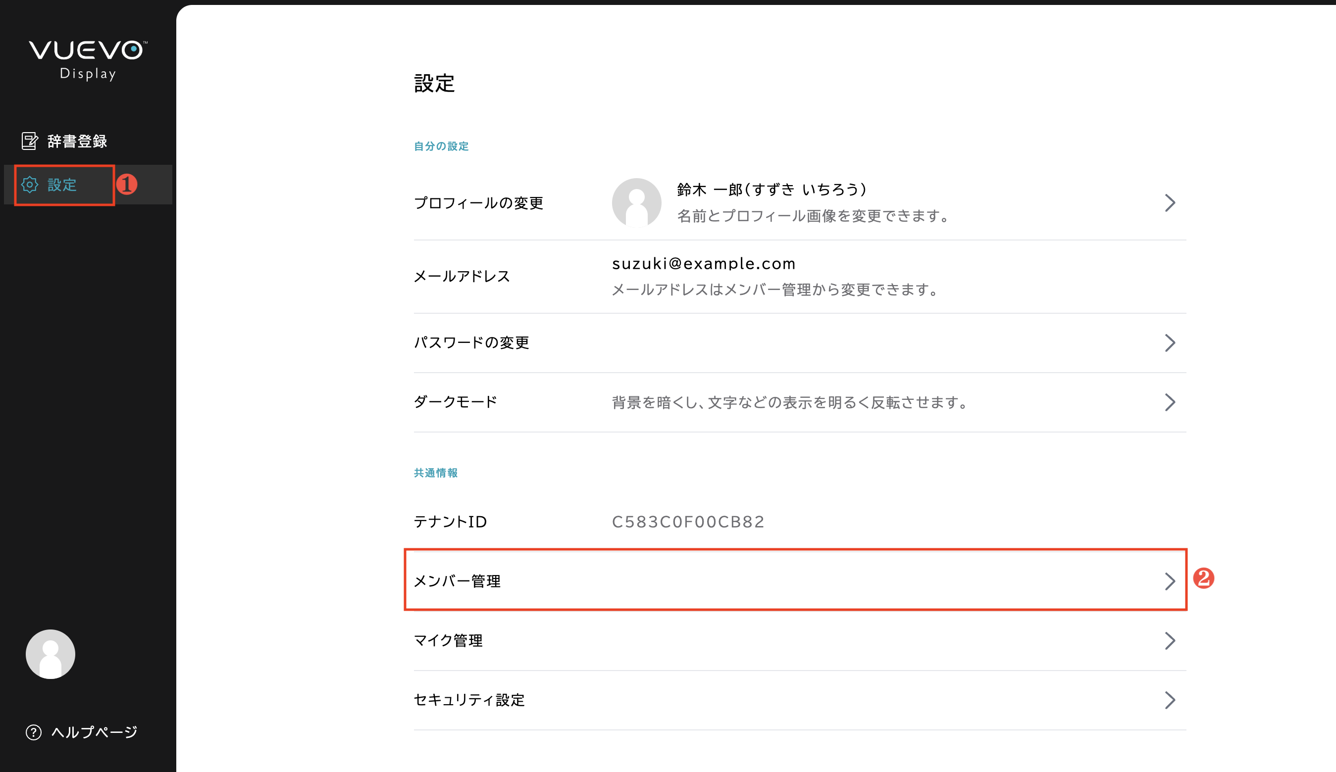 ❶PCのVUEVO Display画面左メニュー「設定」から、